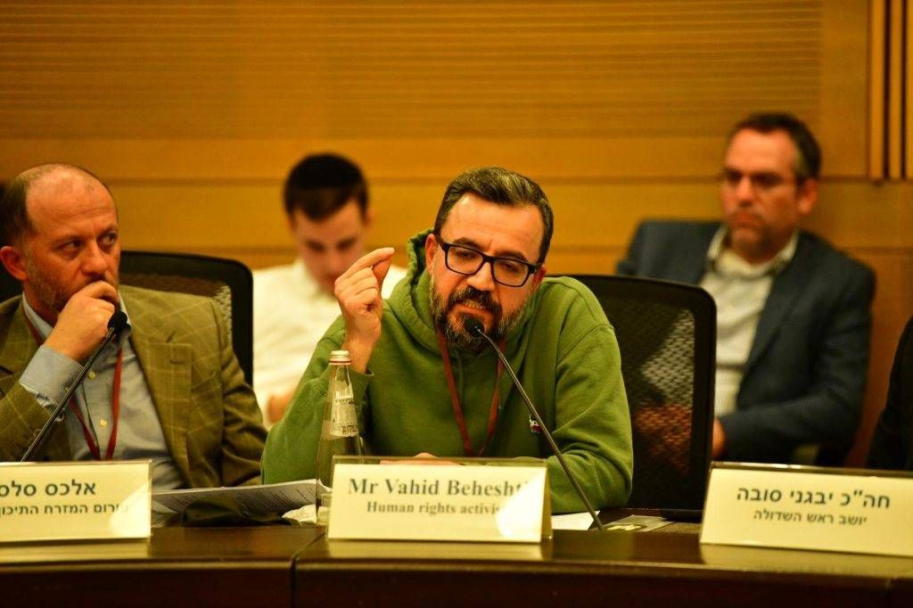 ناشط سياسي إيراني يطالب أمام البرلمان الإسرائيلي بقصف منازل كبار المسؤولين الإيرانيين