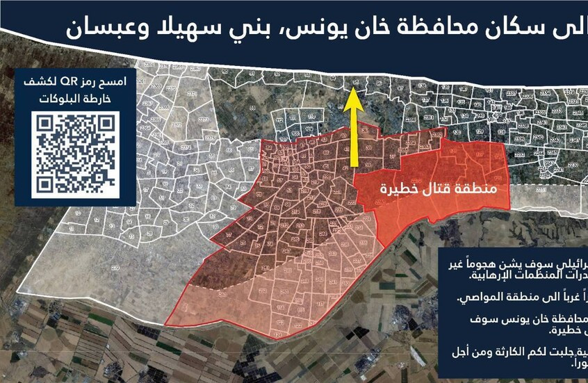أوضح المتحدث باسم الجيش الإسرائيلي للإعلام العربي، الضابط أفيخاي أدرعي، في بيان رسمي نشره عبر منصات التواصل، أن "محافظة خان يونس ستُعتبر منطقة قتال خطيرة"، محذرًا السكان من البقاء فيها.