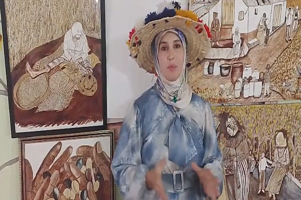 وترسم في لوحاتها نساءً يرتدين الزي الشفشاوني التقليدي، يحملن جرار الماء أو يجلسن في الحقول، لتوثّق لحظات من حياة يومية مهددة بالنسيان.