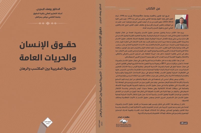 صدر للدكتور يوسف البحيري، الأستاذ الجامعي المغربي، مؤلَّف أكاديمي جديد بعنوان "حقوق الإنسان والحريات العامة.. التجربة المغربية بين المكتسب والرهان"، في عمل فكري يسعى إلى تفكيك مسار حقوق الإنسان بالمغرب، ورصد تحوّلاته وتحدياته، انطلاقاً من مقاربة شاملة تمزج بين الأبعاد الدستورية والقانونية والسياسية.