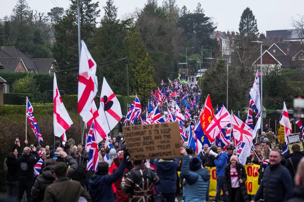 تجمّع مئات المناهضين للهجرة، في بلدة كروبره جنوب إنجلترا، احتجاجاً على خطة حكومية لإيواء طالبي لجوء داخل ثكنة عسكرية سابقة تقع في قلب المدينة، في تحرك يعكس تصاعد التوتر المجتمعي حول سياسات الهجرة واللجوء في البلاد.