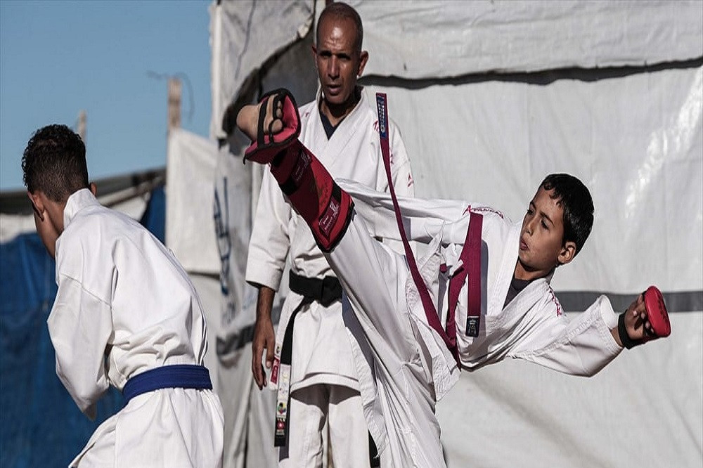 على رمال النزوح.. أطفال غزة يتمسكون برياضة الكاراتيه وسط الدمار